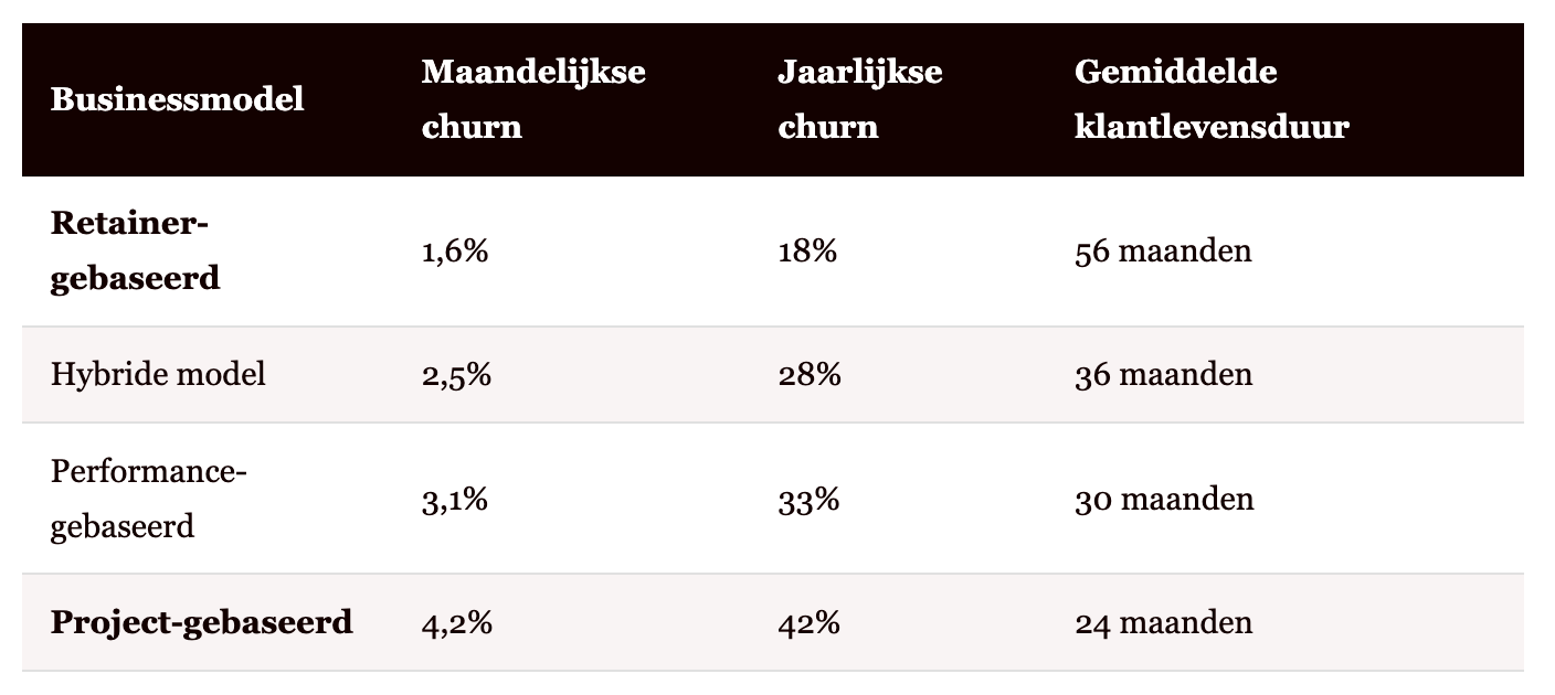 Retainer-agencies houden klanten bijna 2,3 keer langer vast dan projectbureaus - 56 maanden versus 24 maanden. Dat is niet alleen een verschil in contractvorm. Dat is een verschil in businessmodel, in cashflowzekerheid, in strategische waarde die je levert.